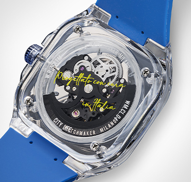 都市生活の激しいペースに翻弄されない存在感を有しながらも、失うことのないエレガンス。それは、まさにミラノの街が長い年月掛けて醸成してきた洗練の極みそのもの。都市生活者たちにとって負担にならないフェザーウェイトでありながらも、超耐久性のハイクオリティポリカーボネート製ケースを採用。日常生活の衝撃から、最も過酷な瞬間まで、あらゆるシーンに耐えられるように設計されています。アシンメトリーな大胆さ、そして不遜ともいえるケースシェイプとスケルトニングされたダイアルデザインは、この時計が象徴する街のように、型にはまらないイデオロギーからもたらされます。